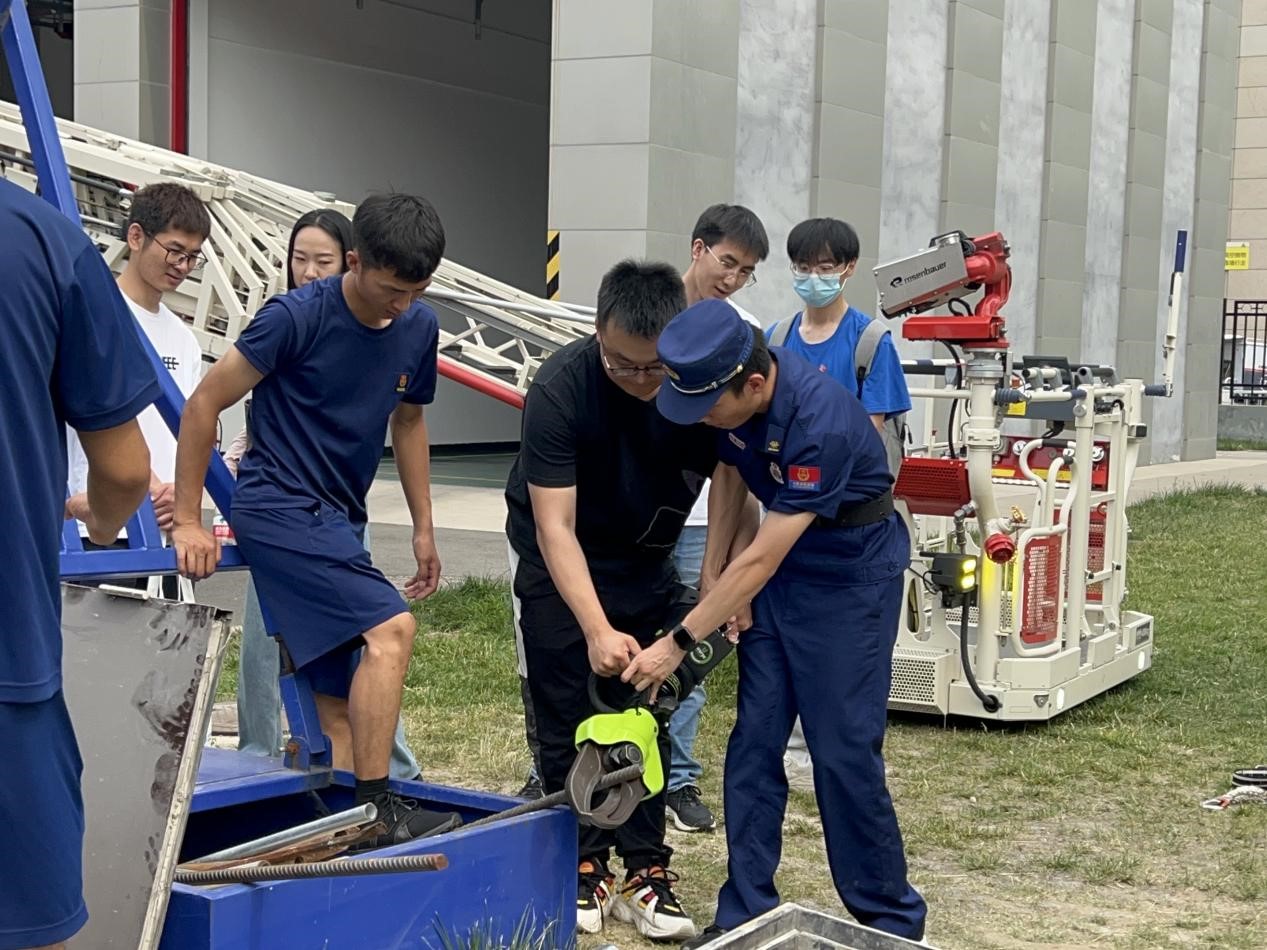 活动的最后我们参观了救援站的各类消防车。齐铭同志详尽的讲解引起了大家广泛的兴趣,泡沫消防车强大的载水量和稳定的性能为消防救援任务提供强有力的保障,云梯消防车具有最大30米的工作高度和47米的水炮射程,可用于高层建筑灭火。在消防员同志的保护和指导下,各位党员同志依次登上消防云梯体验高空升降。云梯车可以将消防人员升到救援地点,以最短最直接的方式讲被困的人员救援下来,以保证人民生命的健康安全。在活动中,我们充分了解学习了消防员的日常工作以及工作的艰苦与复杂性,博士第一党支部纪检委员刘雨昕同学发表了感想:“这次交流会从形式和内容上都非常新颖。对我以及绝大多数同学来说,消防站都是一个非常神秘的存在,能够得到这样密切的交流机会是难得宝贵的。作为一名化学专业的研究生,需要与实验室大量风险点密切打交道,因此对实验室安全措施也应当予以重视,并不断自查。譬如,插线板不可置于地面(防水浸),烘箱不可超期服役(防止温控失灵),加热反应不可随意过夜等,避免一切侥幸心理。毕竟,保障安全就是对消防部门最大的告慰。