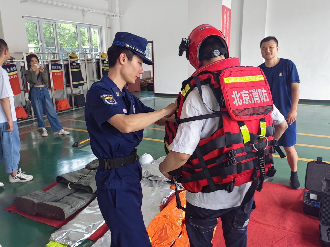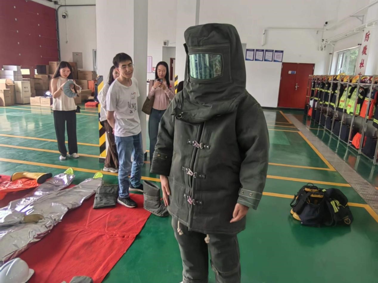 为了体验消防员的工作,我们帮助消防站的同志们用工具剪断钢筋。随后我们参观了消防员同志们的内务,齐铭同志说公安消防部队(武警消防部队)虽然已经退出现役,划归中华人民共和国应急管理部,但是消防人员仍然按照准现役、准军事化标准要求内务。棱角分明的被褥,整齐划一的秩序,给各位党员留下了深刻的印象。他们的住宿环境简单干净,他们的精神如同烈火。我们还穿戴了抵抗恶劣环境的特殊消防服,消防服重量约40斤,在高温下短短几分钟就出了很多汗,亲身体会消防日常工作的艰辛和重要。