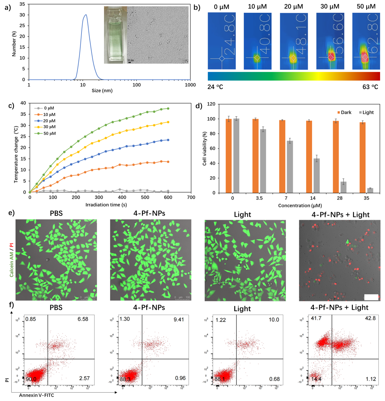 图3. 4-Pf-NPs的光热性质表征及在体外的光热治疗效果研究