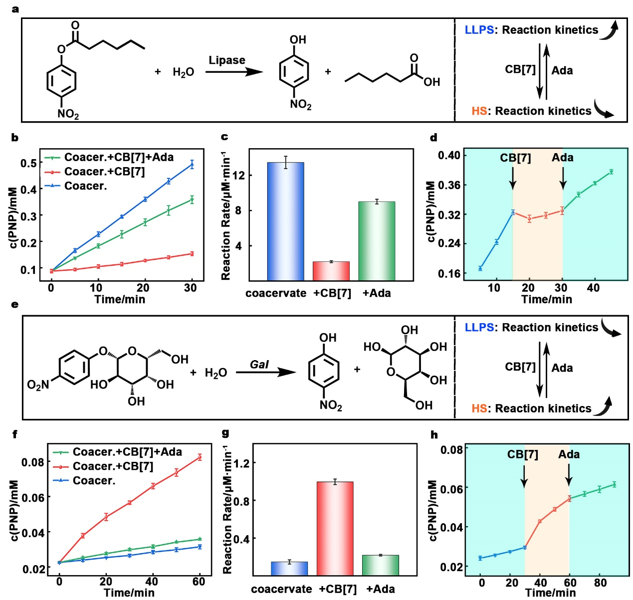 在此基础上,作者进一步通过液-液相分离对酶反应的灵活调控揭示其在细胞内发挥生理作用的分子机制。以酯酶(Lipase)为例,当底物与酶同时被富集到相分离液滴中时,酶反应速率迅速提升;超分子解离液滴后酶反应被抑制。相反,以半乳糖苷酶(β-Galactosidase)为例,当底物与酶被相分离隔离时,酶反应被抑制,超分子解离相分离液滴则能重新激活酶反应。
