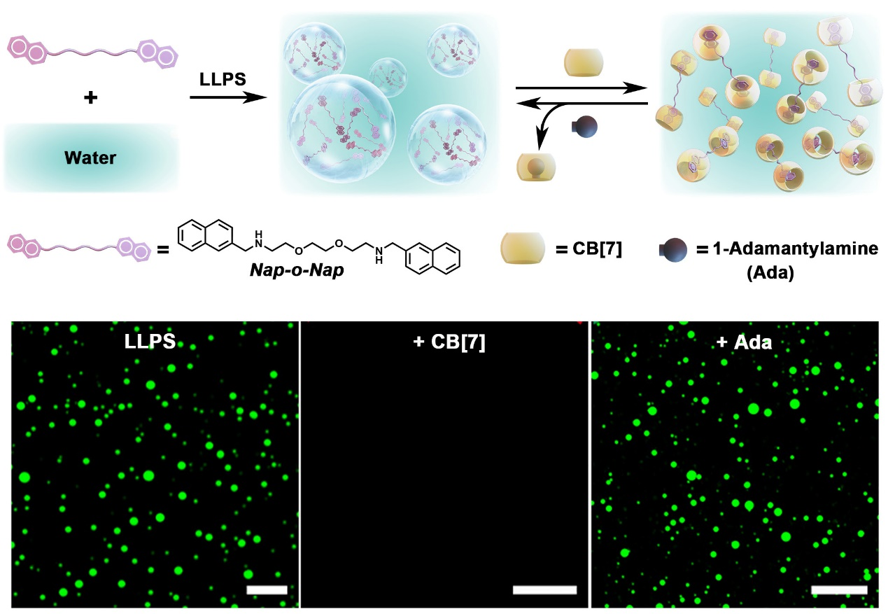 近日,亚洲无码 高宁教授和北京大学黄泽寰研究员合作,通过提取IDPs的关键结构特征,设计合成了一种具备发生液-液相分离能力的小分子:Nap-o-Nap。如下图所示,该化合物由两个萘环和一个乙二醇衍生物连接而成,在生理条件下可以发生类似IDPs的液-液相分离。更为关键的是,该小分子的液-液相分离行为可以通过定量加入葫芦[7]脲和金刚烷铵盐酸盐来实现超分子可逆调控。