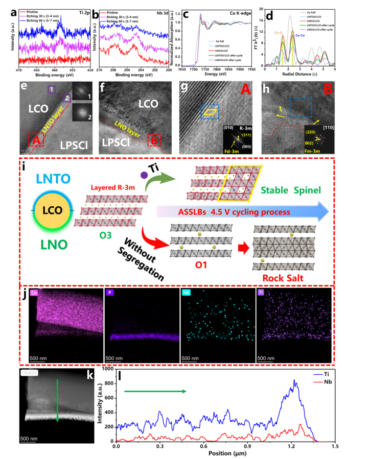 【图1】(a-b)循环后电池正极侧的Ti 2p,Nb 3d的XPS深度分析结果,(c-d)Co的XAFS K边吸收谱及相对应的R空间图,(e)LNTO@LCO循环后界面处的TEM图与FFT结果,(f)LNO@LCO循环后界面处的TEM图,(g)A处TEM放大图及对应区域的FFT结果,(h)B处TEM放大图及对应区域的FFT结果,(i)元素偏析的作用及在循环过程中LCO相变转化的示意图,(j)循环后正极的Co、P、Nb、Ti的EDS Mapping结果,(k-l)HAADF图像和相对应的元素线性分布图。