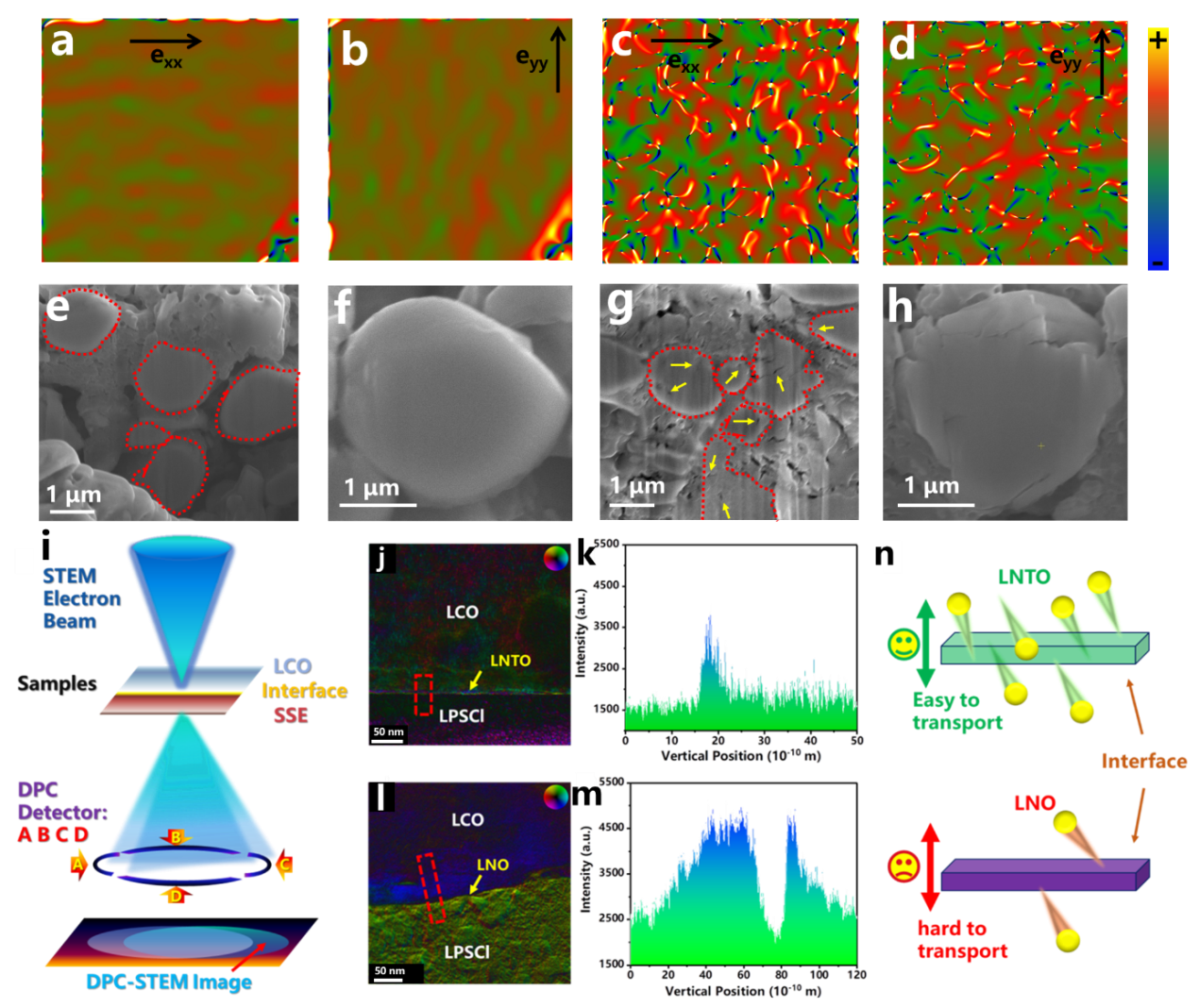 【图2】(a-b)LNTO@LCO正极循环后的x、y方向的GPA应力分布图,(c-d)LNO@LCO正极循环后的x、y方向的GPA应力分布图,(e-f)LNTO@LCO循环后颗粒的截面图及放大的颗粒图,(g-h)LNO@LCO循环后颗粒的截面图及放大的颗粒图,(i)DPC-STEM测试原理的示意图,(j-k)LNTO@LCO界面处的DPC图及电荷强度分布图,(l-m)LNO@LCO界面处的DPC图及电荷强度分布图,(n)界面处离子传输示意图。