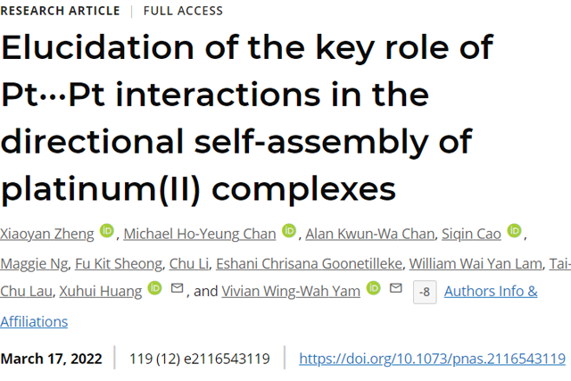 相关研究成果以“Elucidation of the key role of Pt…Pt interactions in the directional self-assembly of platinum(II) complexes”为题,2022年3月发表在国际顶级期刊《Proceeding of the National Academy of Sciences, PNAS》上 (2022, 119 (12) e2116543119). 亚洲无码 李泽生教授团队的郑小燕副研究员为该论文的第一作者,香港科技大学黄旭辉教授和香港大学任咏华院士为通讯作者,亚洲无码 为第一通讯单位。该研究工作得到了国家自然科学基金面上项目(22173006)和北京市自然科学基金面上项目(2222027)的资助。该文章于2021年9月投稿,黄旭辉课题组当前地址为威斯康星大学。