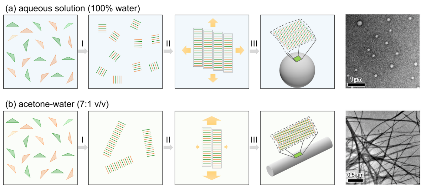 综合上述研究结果,该研究提出了不同溶剂环境下PtB的分子组装机理:在水溶液疏水相互作用占主导地位,具有方向性的Pt···Pt与π-π相互作用较弱,PtB采取等链生长机制,形成球形的囊泡;在丙酮和水混合溶液中,Pt···Pt与π-π的定向诱导作用占主导,疏水相互作用减弱,倾向于以成核增长机制生长,形成纳米纤维。该工作将理论计算与实验有机结合,为Pt(II)配合物作为超分子构筑基元的功能材料设计和自组装过程的精确控制提供了理论依据,所开发的力场参数也广泛适用于其他Pt(II)配合物的组装过程的模拟。