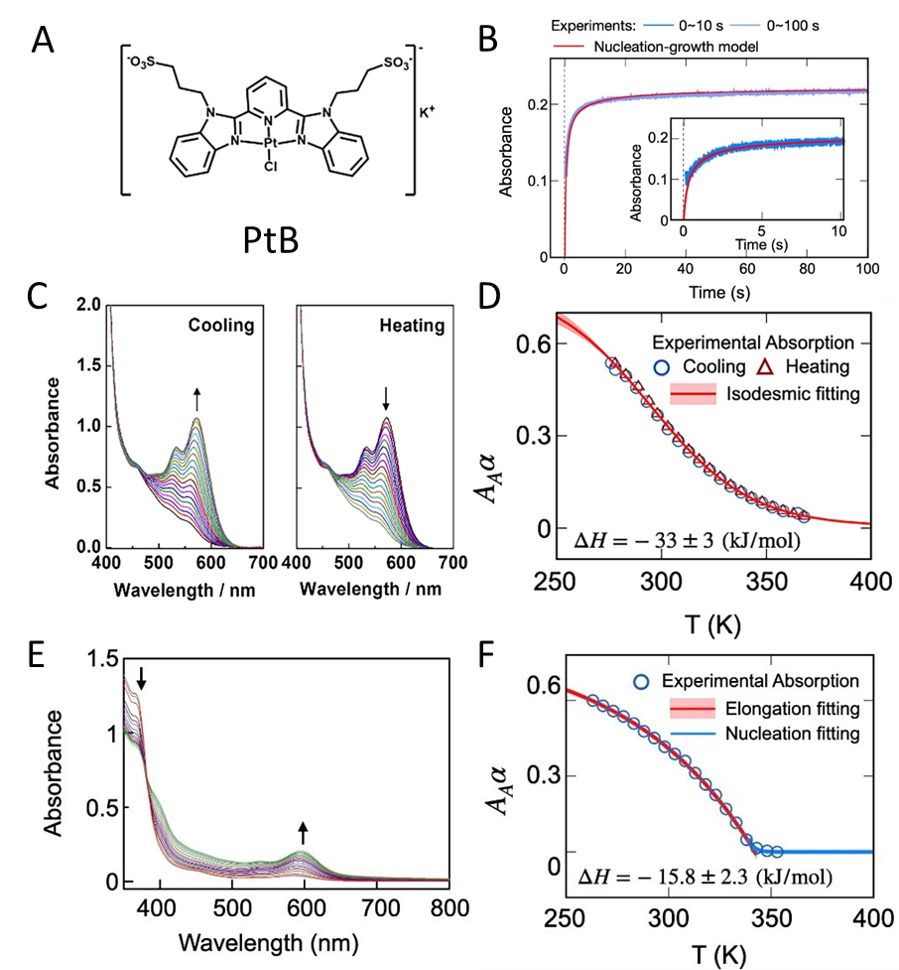 亚洲无码 李泽生教授团队的郑小燕副研究员、香港科技大学的黄旭辉教授和香港大学的任咏华院士合作对不同溶剂环境下两亲性Pt(II)配合物PtB的分子组装机制进行了系统的研究。由于分子间Pt···Pt相互作用会产生新的光谱信号,通过变温紫外可见光谱可获取平衡态PtB的组装体相对于单体的比例(α)随温度的变化,作者分别通过等键模型(Isodesmic model)和成核增长模型(Nucleation-Elongation model)拟合不同溶剂下PtB的α-T曲线来探索其分子组装体生长机制。研究发现:在纯水溶液中,α-T曲线符合等键增长模型,所得平衡常数分别为Ke300K = 2.4×103 M-1和Ke368K = 2.6×102 M-1;在丙酮和水混合溶液中,α-T曲线符合成核增长模型,所得平衡常数为Ke298K = 2.6×103 M-1和Ke328K = 1.4×102 M-1。同时成核过程对应的平衡常数为5.0×10-6。此外,作者通过Stopped-flow吸收光谱实验测定了PtB在丙酮和水混合溶液中的组装过程动力学。结果发现,实验数据符合成核增长模型:在t=0.1s时,PtB具有1.1×10-6 M s-1的成核速率,随后成核速率急剧下降直至1.0 s时几乎可忽略不计。在t=0.1s时,PtB的生长速率为10.6 s-1,随着PtB单体被消耗和分子组装体间的融合,其生长速率逐渐降低。这一结果表明PtB在丙酮和水混合物溶液中的组装过程符合成核增长形成机制。