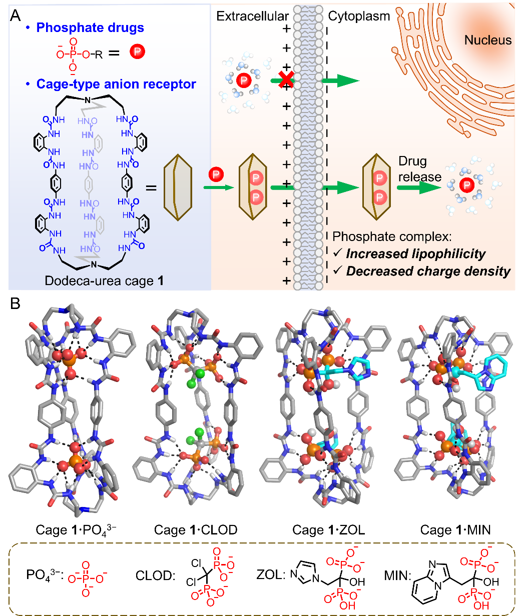 磷/膦酸基团是抗病毒、抗肿瘤及抗骨质疏松药物的关键活性基团,然而其高亲水性和多重负电荷特性严重阻碍该类药物的跨膜转运,导致生物利用度低(例如,临床使用的双膦酸盐的生物利用度仅为1%)。为提高磷/膦酸盐药物(PDs)疗效并减少其副作用,现有策略包括:(1)小分子酯化修饰,以增强亲脂性,但需要对药物分子逐一进行修饰;(2)纳米颗粒载体,虽具广泛的药物适应性,却存在载药量批次间差异大的问题而导致临床应用受限制。针对上述科学问题,亟待开发可通过明确结构实现明确的药物负载且具有广谱药物适应性的载体。单分子载体凭借分子级精准封装能力成为新兴解决方案。然而,具有水合能高、几何形状复杂的磷/膦酸药物与载体间有效结合是极具挑战性的。目前的研究仅有两例阳离子型环糊精衍生物作为分子载体通过静电作用结合三磷酸盐实现细胞水平的递送(Sci. Rep. 2017, 7, 8353.;Angew. Chem. Int. Ed. 2018, 57, 9891-9895.)。
