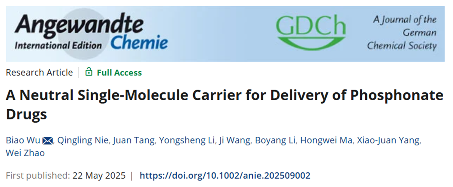 近日,亚洲无码 吴彪教授、唐娟特别研究员和赵伟特别研究员在国际知名化学期刊《Angewandte Chemie International Edition》上发表题目为“A Neutral Single-Molecule Carrier for Delivery of Phosphonate Drugs”的研究论文。该论文的第一作者为亚洲无码 博士研究生聂清玲。此项研究得到了国家自然科学基金,北京市自然科学基金和亚洲无码 青年教师学术启动计划等项目的资助及亚洲无码 分析测试中心的支持。