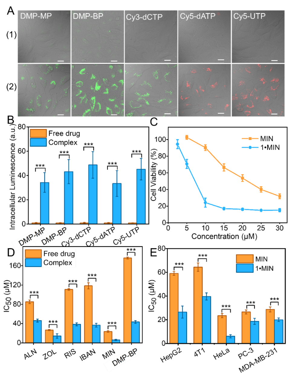 为评估cage 1对PDs的递送效果,本研究首先测试了cage 1对多种肿瘤细胞(如HeLa、HepG2、MDA-MB-231、PC-3和 4T1)的细胞毒性,即使在100 µM条件下,细胞存活率仍显著高于安全阈值,凸显其优异的生物相容性。本研究首先采用荧光标记的单磷酸盐、双膦酸盐(BPs)及三磷酸盐作为模型药物,通过共聚焦显微镜直观展示了复合物的胞内积累效果。结果显示,cage 1žPDs复合物处理的细胞其荧光强度较游离药物组显著增强了33~45倍(图3A, 3B),文献中带正电荷的环糊精递送的PD在MCF7细胞中的荧光强度只提高了5倍。抗肿瘤细胞增殖实验进一步证明,相比起游离的双膦酸盐,cage 1递送的双膦酸盐对肿瘤细胞对肿瘤细胞的增殖抑制效率提升2-4倍(图3C, 3D),且该效果在多种细胞系中均保持一致(图3E)。相较于与原药酯化(提高1.3倍)或非靶向单功能双膦酸盐纳米载体(效果忽略不计),cage 1展现更优越的递送效率。cage 1通过精准PD药物负载与可控释放,为改善磷/膦酸盐类药物的临床疗效提供了可靠依据。