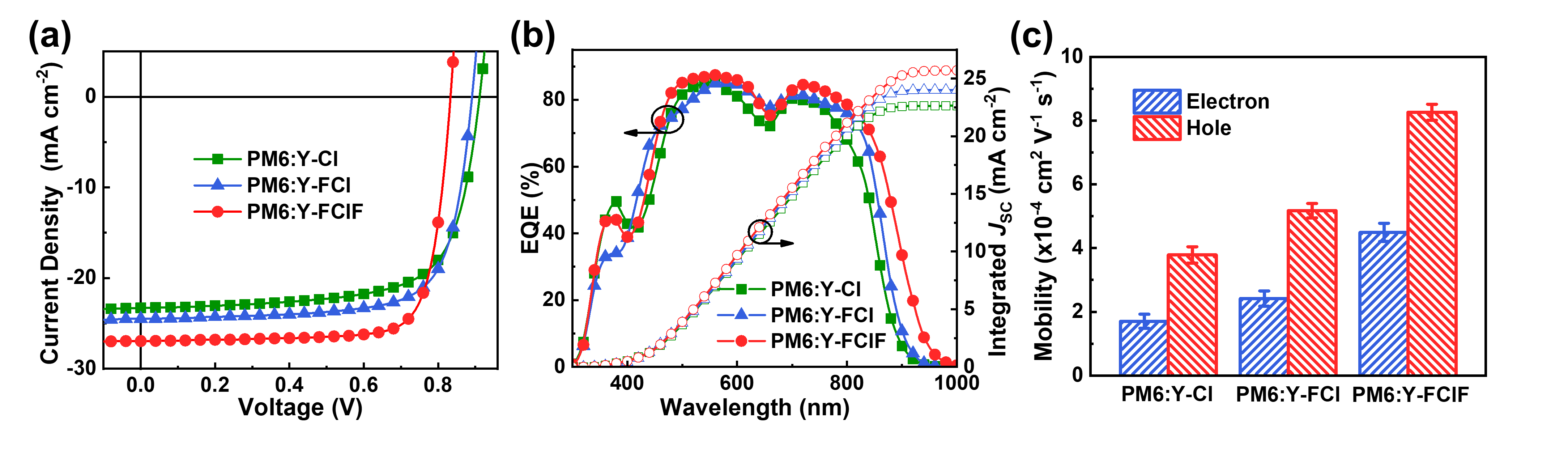 图3. (a)太阳能电池的J-V曲线;(b)EQE外量子效率图;(c)载流子迁移率柱状图。
