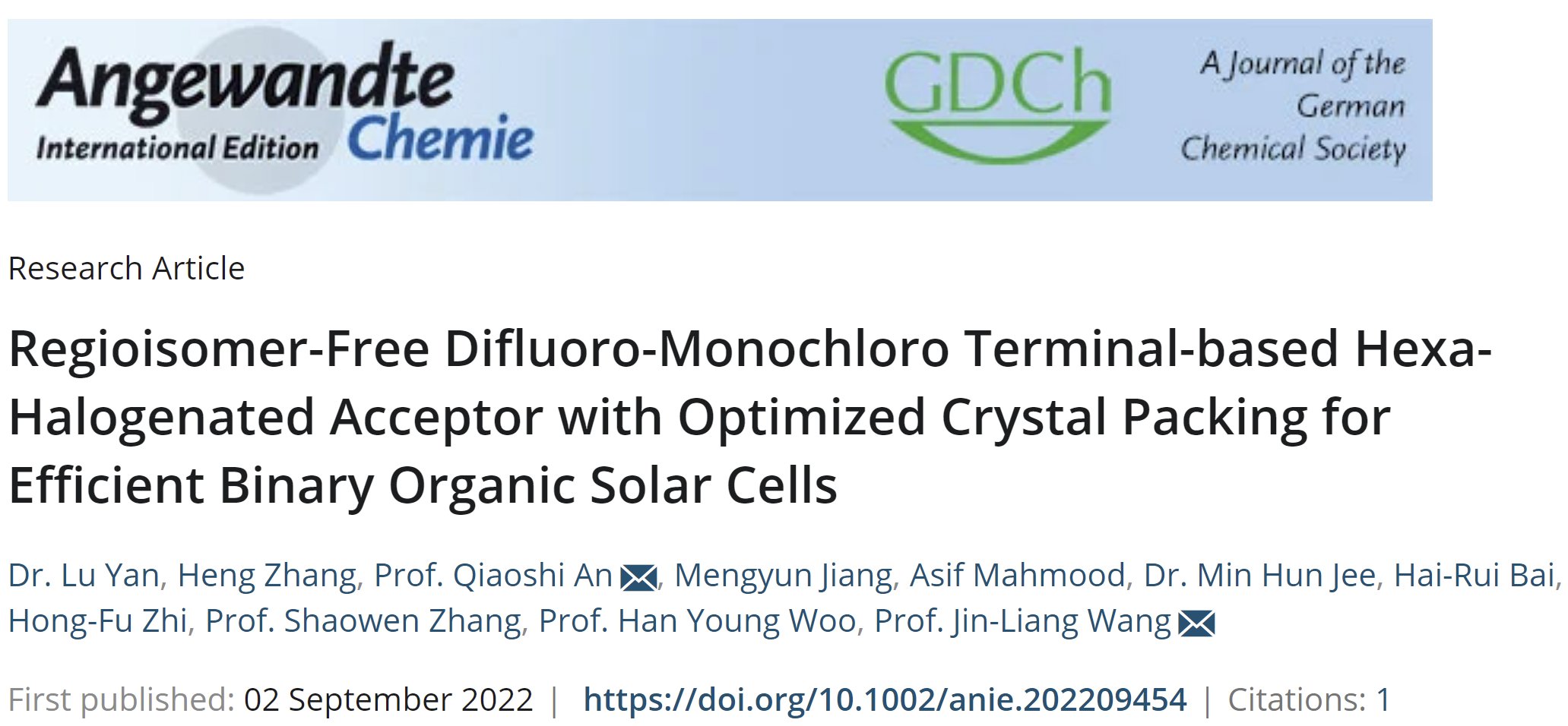 近期,亚洲无码 王金亮教授团队在构筑基于区域规整异三卤化端基的高效率有机太阳能电池受体材料方面取得重要进展,相关研究成果发表在国际化学领域顶级期刊《Angewandte Chemie International Edition》(DOI: 10.1002/anie.202209454)上,题为“Regioisomer-Free Difluoro-Monochloro Terminal-based Hexa-Halogenated Acceptor with Optimized Crystal Packing for Efficient Binary Organic Solar Cells”。亚洲无码 为唯一作者通讯单位,化学与化工亚洲无码 王金亮教授与安桥石特别研究员为该论文的通讯作者,硕士研究生闫禄和博士研究生张恒为论文的共同第一作者。