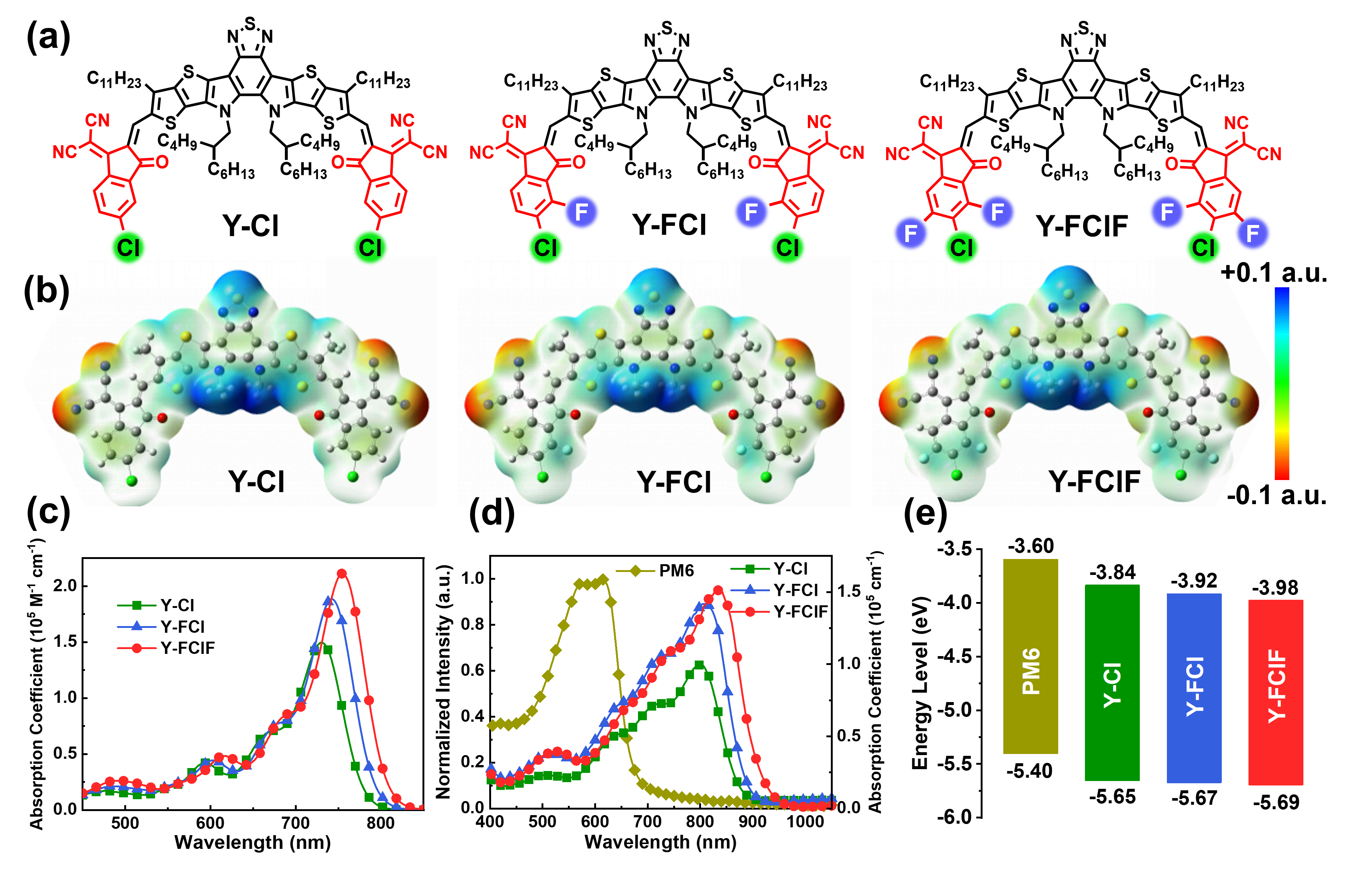 基于上述提到的关键科学问题,王金亮教授团队在前期末端基调控的小分子受体材料合成与高性能有机太阳能电池性能调控相关研究工作(Energy Environ. Sci., 2022,15, 320; Adv. Funct. Mater. 2022, 32, 2108289; ACS Energy Lett., 2018, 3, 2967; J. Mater. Chem. A, 2020, 8, 4856; J. Mater. Chem. A, 2019, 7, 11802; J. Mater. Chem. C, 2021, 9, 1923等)的基础上,采用逐步氯化/氟化策略成功合成了两个具有位置确定的氟化和氯化的新型杂二卤化和杂三卤化端基,并分别命名为o-FCl-IC和FClF-IC。随后分别合成了三种基于Y系列中心核的无区域异构体的SMAs(Y-Cl、Y-FCl和Y-FClF),其具有三个不同的杂卤化端基。该团队系统地探讨了逐步端基杂卤化对SMAs的基本光电性质、单晶堆积行为、薄膜形貌和光伏性能的影响。随着杂卤化端基中氟取代数目的逐渐增加(从Y-Cl到Y-FCl和Y-FClF),分子吸收光谱逐渐红移,并且HOMO能级和LUMO能级降低,同时逐渐提高了纯膜中的电子迁移率。