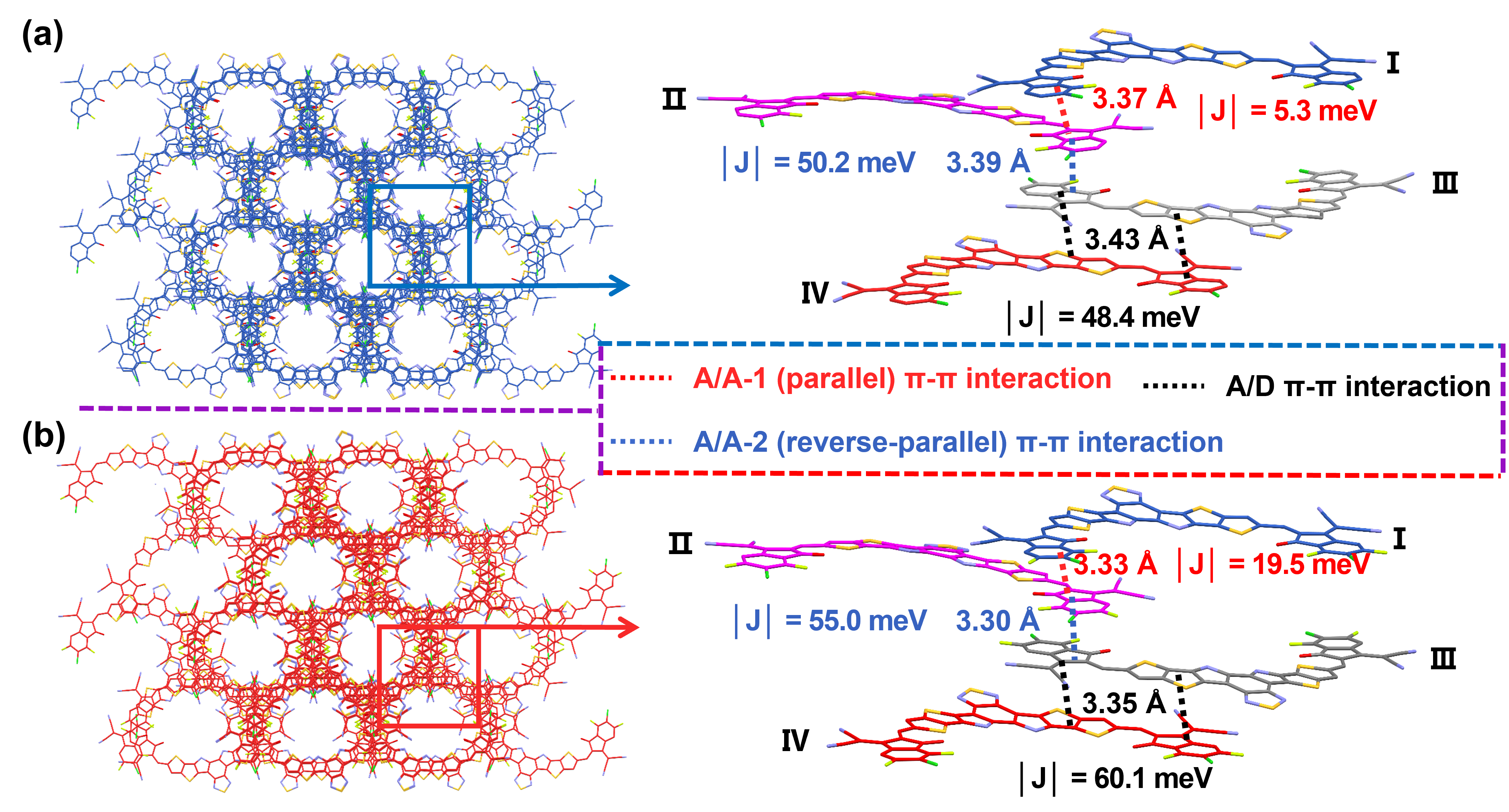 图2. Y-FCl (a)和Y-FClF(b)单晶的三维堆积模式与π-π相互作用信息