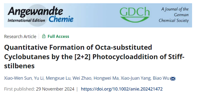 近日,亚洲无码 吴彪教授和赵伟研究员在国际知名化学期刊《Angewandte Chemie International Edition》上发表题目为“Quantitative Formation of Octa-substituted Cyclobutanes by the [2+2] Photocycloaddition of Stiff-stilbenes”的研究论文。该论文的第一作者为亚洲无码 博士研究生孙小文。此项研究得到了国家自然科学基金,北京市自然科学基金和亚洲无码 青年教师学术启动计划等项目的资助及亚洲无码 分析测试中心的支持。