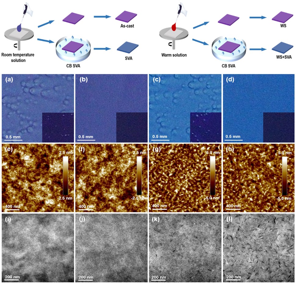 在本项研究中,研究者采用了热溶液(warm solution, WS)和溶剂熏蒸退火(solvent-vapor annealing,SVA)双管齐下的策略来调控小分子有源层的形貌。其中WS不仅能够提升给受体材料(B1和BTP-eC9)的溶解度,而且在成膜过程中能够加速溶剂挥发,减少成膜时间,使有源层中分子分布更加均匀,形成光滑无孔的混合薄膜;SVA可调控成膜后的分子动力学,延长分子自组装时间。通过控制SVA时间可优化有源层中的相分离和分子排布。通过WS+SVA的协同作用,有源层形貌得到较大改善,提升了器件的光子俘获、激子解离、载流子传输和收集,从而使其获得15.68%的效率,这是当时二元小分子OSCs的最高效率值。