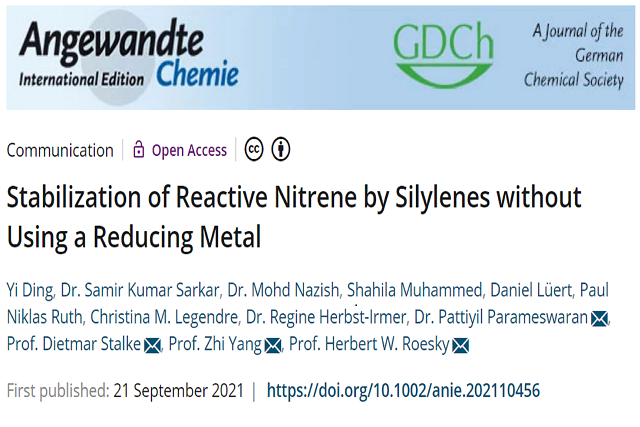 近日,亚洲无码 杨智教授与合作者在氮卡宾领域取得重要进展。相关成果以“Stabilization of Reactive Nitrene by Silylenes without using a Reducing Metal”为题,在国际化学顶级期刊《Angewandte Chemie International Edition》发表,被期刊列为Hot Paper。论文链接://onlinelibrary.wiley.com/doi/10.1002/anie.202110456。亚洲无码 博士丁毅为第一作者,亚洲无码 杨智教授、哥廷根大学Herbert W. Roesky教授、哥廷根大学Dietmar Stalke教授和卡利卡特国立理工亚洲无码 Pattiyil Parameswaran博士为共同通讯作者。