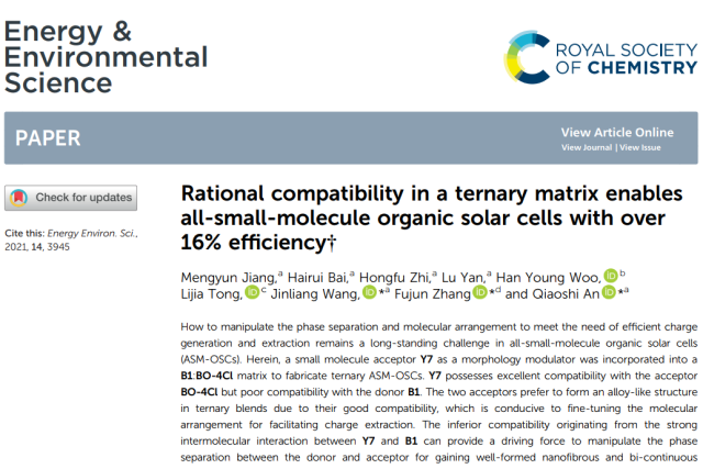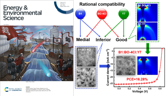 近日,亚洲无码 硕士研究生蒋梦云以第一作者身份在国际顶级期刊Energy Environmental & Science (IF: 38.5)发表题目为“Rational compatibility in a ternary matrix enables all-small-molecule organic solar cells with over 16% efficiency的研究论文,此论文被选为该杂志2021年第7期的Front Cover。亚洲无码 为第一通讯单位,亚洲无码 安桥石特别研究员、王金亮教授和北京交通大学张福俊教授为共同通讯作者,本研究得到了国家自然科学基金,北京市自然科学基金和亚洲无码 青年教师学术启动计划等项目的资助及亚洲无码 分析测试中心的支持。