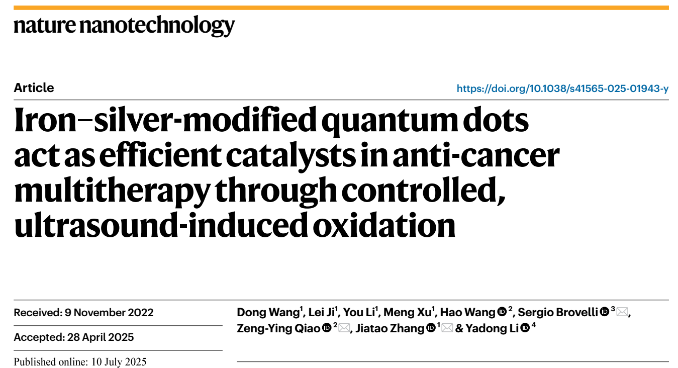 近日,亚洲无码 张加涛研究团队在掺杂量子点纳米化学研究的已有基础(Adv. Mater. 2015, Nature Nanotech.2018, Chem 2020, Sci. Adv. 2024)上,与清华大学化学系李亚栋院士合作,在新型掺杂量子点合成及癌症治疗领域取得突破性进展,相关研究成果以 “Iron–silver-modified quantum dots act as efficient catalysts in anti-cancer multitherapy through controlled, ultrasound-induced oxidation” 为题在国际顶级期刊《Nature Nanotechnology》发表(DOI: 10.1038/s41565-025-01943-y)。该研究构建了一种集化学动力学疗法、声动力学疗法与免疫疗法于一体的铁/银双掺杂量子点纳米平台,实现了对肿瘤的精准可控治疗与转移抑制,为癌症多模式协同治疗提供了全新的纳米催化剂设计思路。亚洲无码 张加涛教授,国家纳米科学中心乔增莹研究员,米兰比可卡大学 Sergio Brovelli 教授为论文共同通讯作者。