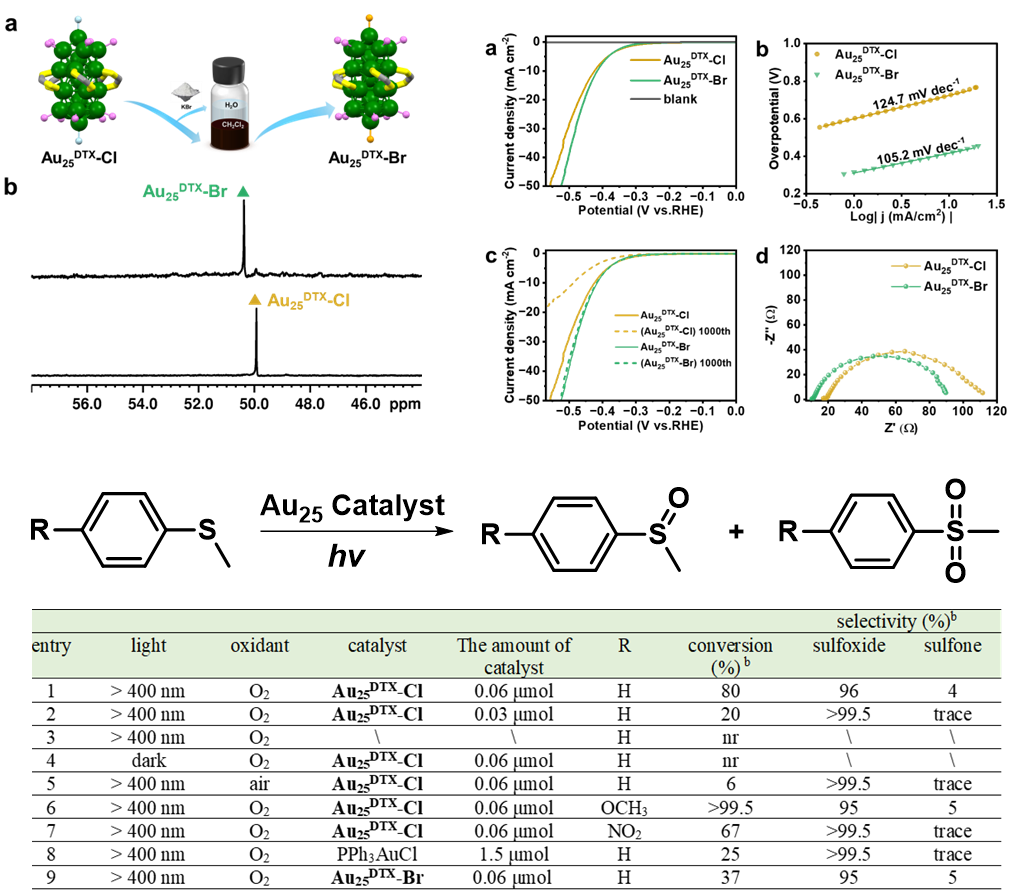 阴离子交换实验证明Au25DTX-Br相对于Au25DTX-Cl具有更好的稳定性。为了进一步探究该类交错式构型的Au25纳米棒的催化性质,该团队进行了光催化硫醚氧化和电催化产氢实验,实验结果证明团簇的催化性质高度依赖于团簇构型及结构稳定性(图5)。