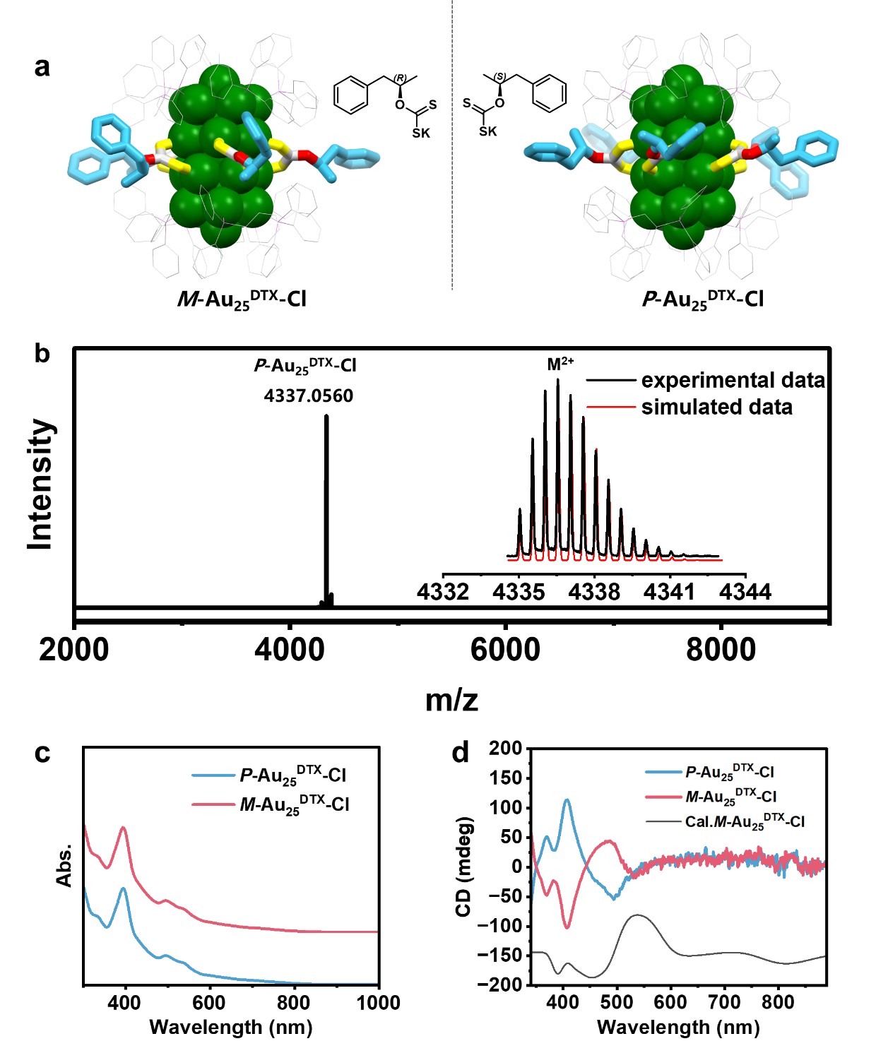 图4. P-Au25DTX-Cl and M-Au25DTX-Cl 结构示意图,UV-vs和CD谱图。