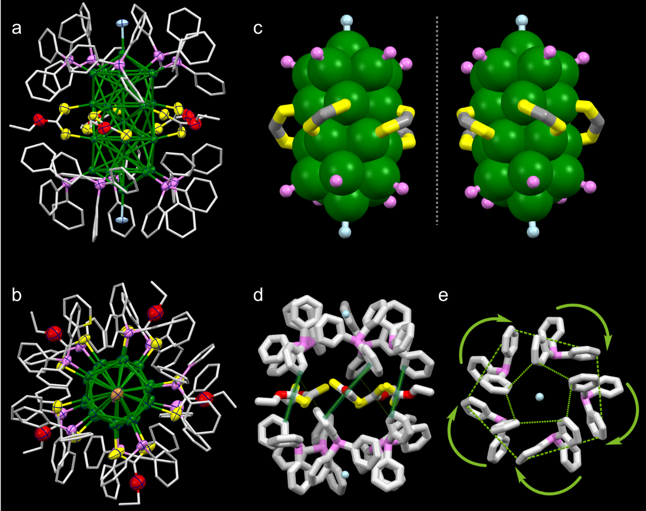 近日,该团队首次使用二硫代碳酸盐(DTX)配体合成了从未报道过的两个交错式(staggered)构型的Au25纳米棒,[Au25(DTX)5(PPh3)10Cl2]2+ (Au25DTX-Cl)和[Au25(DTX)5(PPh3)10Br2]2+ (Au25DTX-Br)。不同于之前报道过的重叠式(eclipsed) D5h对称性的Au25纳米棒,DTX配体保护的Au25具有交错式的手性D5构型,DTX配体的使用诱导对称性破缺,实现了由非手性配体构筑手性金纳米团簇。实验结果结合理论计算(DFT)表明,交错式构型是发射波长红移至近红外二区(NIR-Ⅱ)的主要原因,使得该类金纳米团簇在生物成像等方面展示了巨大应用潜力。