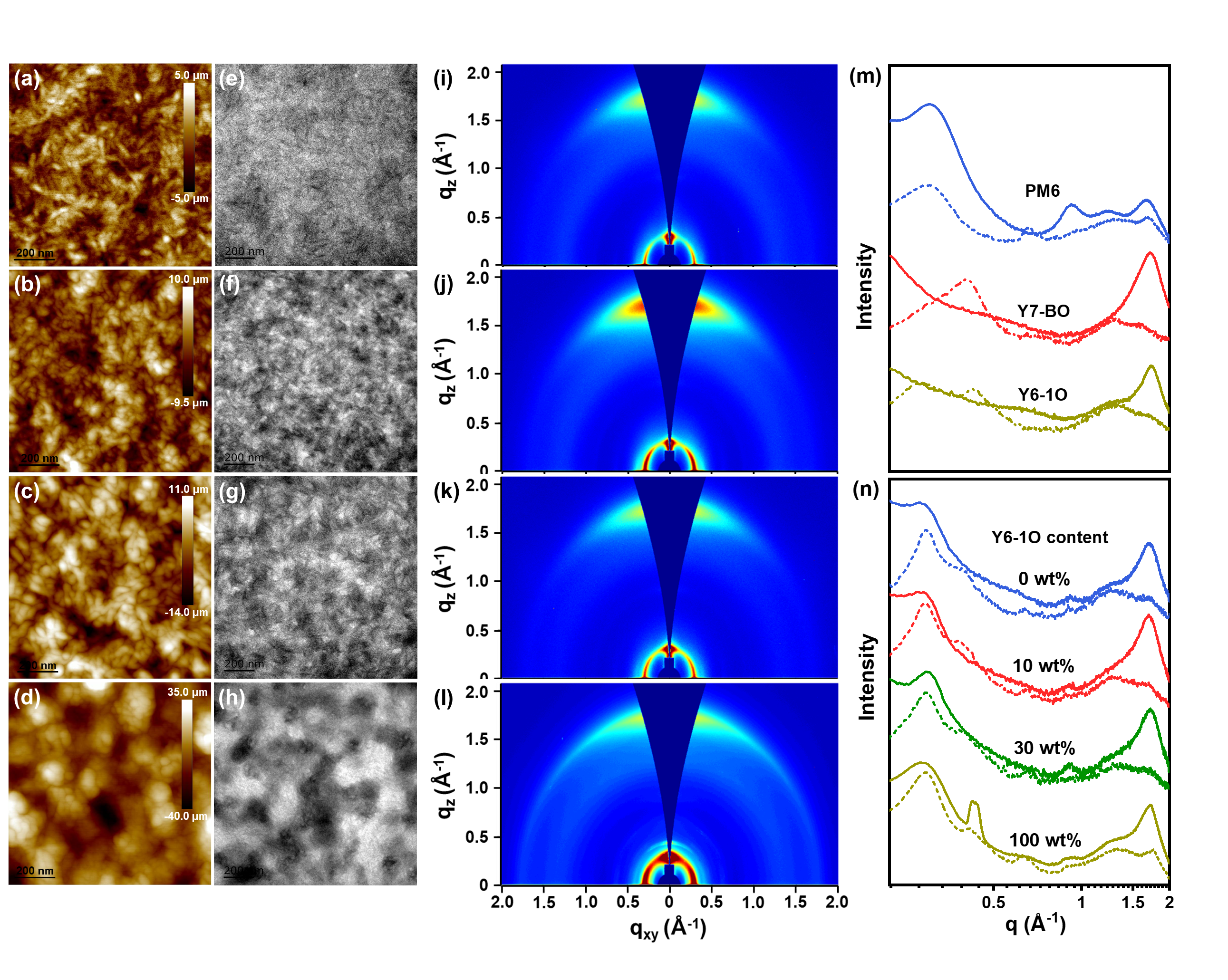 考虑到同源衍生物具有相似的分子结构和良好的兼容性,通过使用同构型小分子Y6-1O和Y7-BO作为受体,明星聚合物PM6作为给体来制备高性能三元器件。Y6-1O与Y7-BO具有类似的“BTP”稠环分子骨架,使得两个受体之间具有极好的兼容性,从而有利于精细调控三元共混物的形貌以获得优化的短路电流密度和填充因子。另一方面,不同的卤素取代端基和两个受体中不同的不对称或对称核心单元能够提供互补的吸收和可调节的能级,这有助于在短路电流密度与开路电压之间获得良好的平衡。