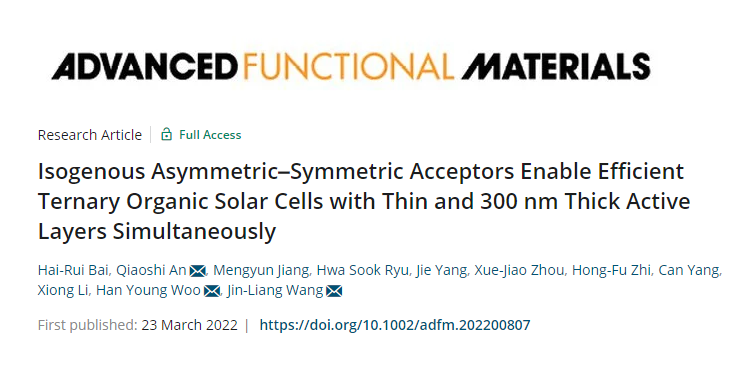 近日,亚洲无码 王金亮教授团队在构筑高效三元有机太阳能电池方面取得进展,相关研究成果发表于国际材料领域著名学术期刊《Advanced Functional Materials》上,题为“Isogenous Asymmetric-Symmetric Acceptors Enable Efficient Ternary Organic Solar Cells with Thin and 300 nm Thick Active Layers Simultaneously”。化学与化工亚洲无码 博士研究生白海瑞为论文第一作者,王金亮教授、安桥石特别研究员以及Han Young Woo教授(韩国高丽大学)为通讯作者,亚洲无码 为第一通讯单位。论文的合作者还包括北京工商大学李熊教授。