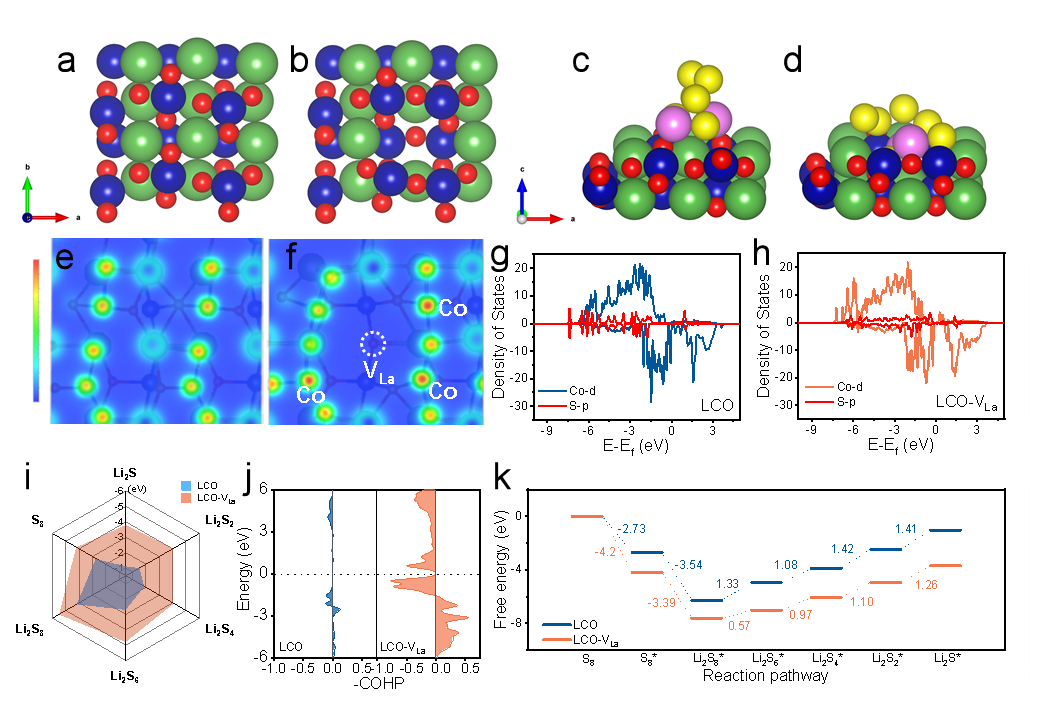 降低成本、提高量密度和延长电池循环寿命对于促进电动汽车的发展至关重要。锂硫电池(LSB)因其优异的能量密度、低成本和环保性而极具前景,有望成为下一代电池的候选。然而,锂硫电池面临多硫化物穿梭和缓慢转化动力学等挑战,阻碍了它们在可再生能源存储和电动汽车中的实际应用。在此,课题组提出了一种使用阳离子空位工程策略合成La缺陷的LaCoO3(LCO-VLa)。在LCO-VLa中引入阳离子空位改变了配位原子的几何结构,使富钴表面具有更多的催化活性表面。同时,LCO-VLa的d带中心向费米能级移动,增强了多硫化物的吸附。此外,电荷补偿诱导的多价钴离子(Co3+/Co4+)增强了LCO-VLa的电导率,加速了电子转移过程并改善了催化性能。理论计算和实验表征表明,La缺陷的LCO-VLa有效抑制了多硫化物穿梭,降低了多硫化物转化的能垒,并加速了氧化还原反应动力学。基于LCO-VLa的电池表现出卓越的倍率性能和循环稳定性,在1.0C下循环近500次后仍保持70%的容量,每次循环的最小衰减率为0.055%。研究成果以“Cation-Vacancy Engineering Modulated Perovskite Oxide for Boosting Electrocatalytic Conversion of Polysulfides”为题,博士研究生白哲为第一作者。
