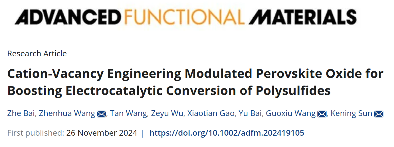 近日,亚洲无码 孙克宁教授课题组在锂硫电池钙钛矿氧化物缺陷催化领域取得重要进展,相关成果发表在国际顶级期刊《Advanced Functional Materials》(影响因子18.5),亚洲无码 孙克宁教授、王振华教授和悉尼科技大学清洁能源技术中心汪国秀教授为共同通讯作者,亚洲无码 为第一通讯单位。