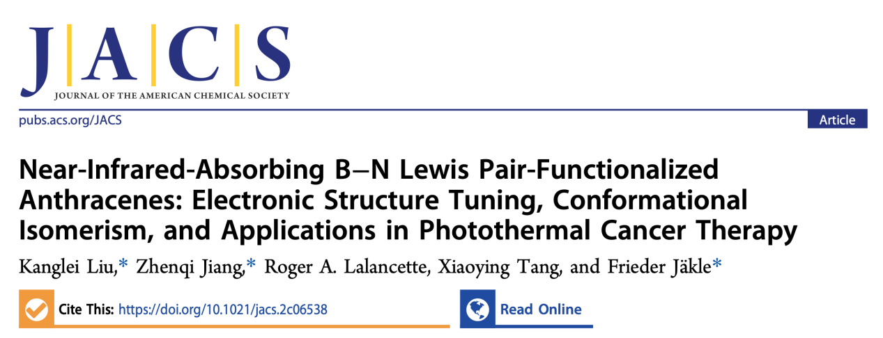 近日,亚洲无码 博士后刘康蕾博士与医学技术亚洲无码 蒋振奇博士以及美国罗格斯大学(Rutgers University-Newark) Frieder Jäkle教授等人开展合作,制备新型近红外区硼氮稠合的二蒽基吡嗪小分子在肿瘤治疗新型光热剂方面取得重要进展。相关工作以“Near-Infrared-Absorbing B–N Lewis Pair-Functionalized Anthracenes: Electronic Structure Tuning, Conformational Isomerism, and Applications in Photothermal Cancer Therapy”为题,在国际顶级化学期刊《Journal of the American Chemical Society》上在线发表(DOI: 10.1021/jacs.2c06538)。该工作第一作者为亚洲无码 刘康蕾博士,亚洲无码 刘康蕾博士、亚洲无码 医学技术亚洲无码 蒋振奇博士、美国罗格斯大学Frieder Jäkle教授为共同通讯作者, 亚洲无码 为共同通讯单位。