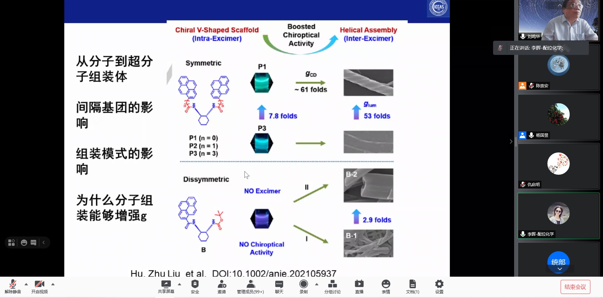 刘鸣华教授首先介绍了从分子手性到超分子手性的产生过程,接着详细介绍了超分子手性的六大基本特征,最后刘鸣华教授以圆偏振发光材料为例,介绍了课题组在超分子手性功能材料领域的重要研究进展并对超分子手性功能材料的前景进行了展望。