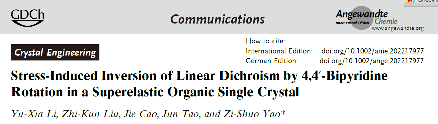 近日,亚洲无码 姚子硕研究员在超弹性分子基单晶材料研究中取得重要进展。相关工作以“Stress-Induced Inversion of Linear Dichroism by 4,4′-Bipyridine Rotation in a Superelastic Organic Single Crystal”为题,发表在国际著名化学期刊Angew. Chem. Int. Ed.。亚洲无码 为唯一作者单位,化学与化工亚洲无码 陶军教授研究团队的姚子硕研究员为文章通讯作者,文章第一作者为亚洲无码 博士研究生李宇霞。