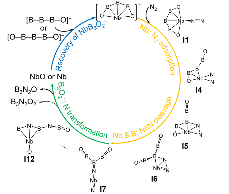 图1. NbB3O2阴离子团簇催化转化N2循环示意图