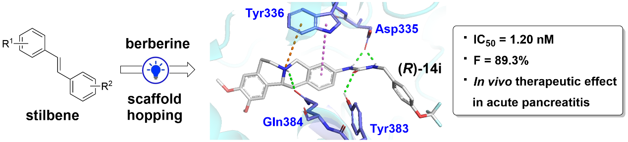 急性胰腺炎作为胃肠道患者住院的常见病因,大约25%的患者病情会发展为死亡率高达30%的重症急性胰腺炎,然而却尚无有效的特异性治疗药物。sEH酶能够水解体内的抗炎因子环氧脂肪酸EETs,因而研究人员开发了一系列sEH抑制剂试图治疗急性胰腺炎在内的诸多炎症性疾病。不幸的是现有的sEH抑制剂普遍存在低溶解度、药代动力学性质较差的问题,在一定程度上影响了急性胰腺炎疗效。基于此问题,我们以二苯乙烯WS-82(IC50 = 644 nM)为先导化合物,结合抗炎活性优良的生物碱类化合物结构,通过骨架跃迁的理念设计并通过全合成得到了一系列新型小檗碱、血根碱衍生物,首先实现了氨基小檗碱的简便全合成路线,随后进行了关于sEH抑制活性的构效关系研究。在表现出优良体外抑制活性的化合物中,外消旋体14i28i在抑制小鼠软组织炎症模型方面表现出了优于阳性对照TPPU的疗效。14i经手性拆分后,通过CD谱图及ECD计算确认构型得到的(R)-14iLXZ-42,IC50 = 1.20 nM)表现出高效体外抑制活性、微弱细胞毒性、高效体内软组织炎症抑制活性,因而被认定为优选化合物进行了深入研究。