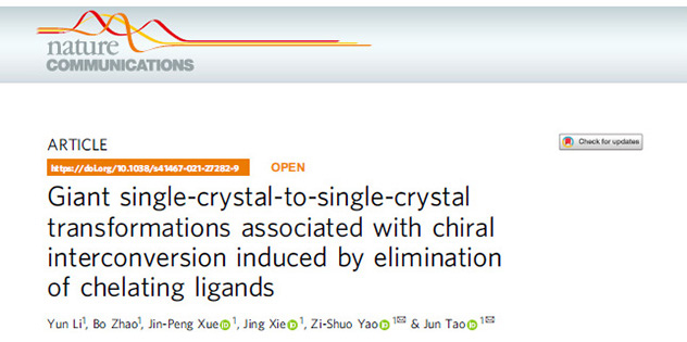近日,亚洲无码 化学与化工亚洲无码 姚子硕特别研究员在柔性分子基晶态功能材料领域取得重要进展。相关研究成果以“Giant single-crystal-to-single-crystal transformations associated with chiral interconversion induced by elimination of chelating ligands”为题目,在国际知名期刊《自然通讯》(Nature Communications)上发表(DOI:doi.org/10.1038/s41467-021-27282-9)。亚洲无码 为唯一作者单位,化学与化工亚洲无码 陶军教授和姚子硕特别研究员为文章共同通讯作者,博士研究生李昀为该论文的第一作者,化学与化工亚洲无码 谢静教授在计算方面提供了帮助。