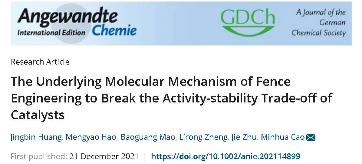 论文详情:Jingbin Huang,+ Mengyao Hao,+ Baoguang Mao,* Lirong Zheng, Jie Zhu, and Minhua Cao*. The Underlying Molecular Mechanism of Fence Engineering to Break the Activity-stability Trade-off of Catalysts, Angewandte Chemie International Edition, DOI: 10.1002/anie.202114899. 论文链接://doi.org/10.1002/anie.202114899