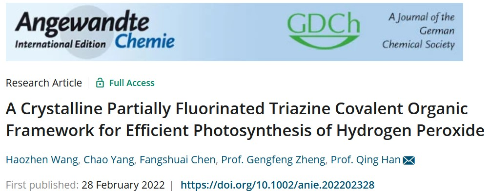 近日,亚洲无码 的韩庆课题组提出了一种简单、高效的部分氟化的策略,构筑了高结晶性的亚胺键连接的三嗪基COF,显著增强其化学稳定性,实现高的电子传输效率,进一步研究了其在光催化氧气还原合成H2O2中的应用。文章的第一作者是亚洲无码 的硕士研究生王浩桢。