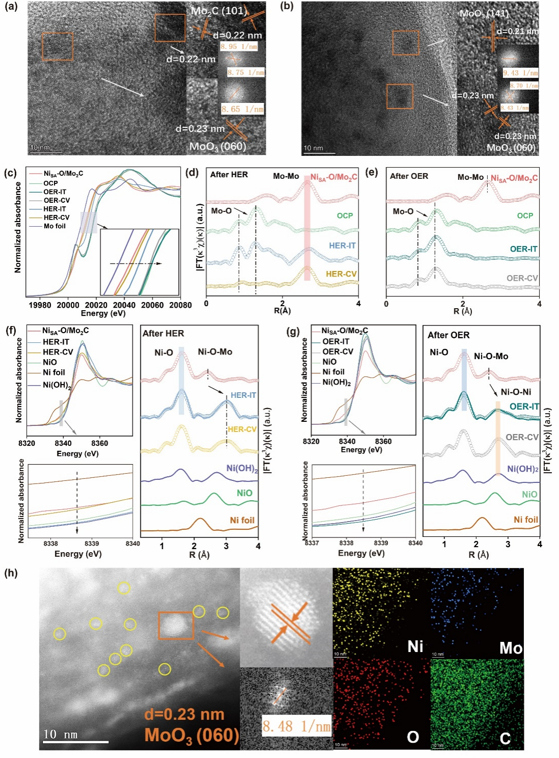 通过准原位同步辐射、球差电镜等对HER、OER反应后的NiSA-O/Mo2C催化剂进行结构形貌分析,结果表明在HER反应后,含氧Mo2C基底部分溶解、反应生成MoOx,但Ni物种仍保持单分散的状态,同时Ni-O和Ni-Mo(Ni-O-Mo)的配位数和键长发生了变化;而在OER反应后,不仅含氧Mo2C基底完全溶解、反应生成MoOx,同时Ni单原子在施加电势的驱动下重构成了Ni小团簇。