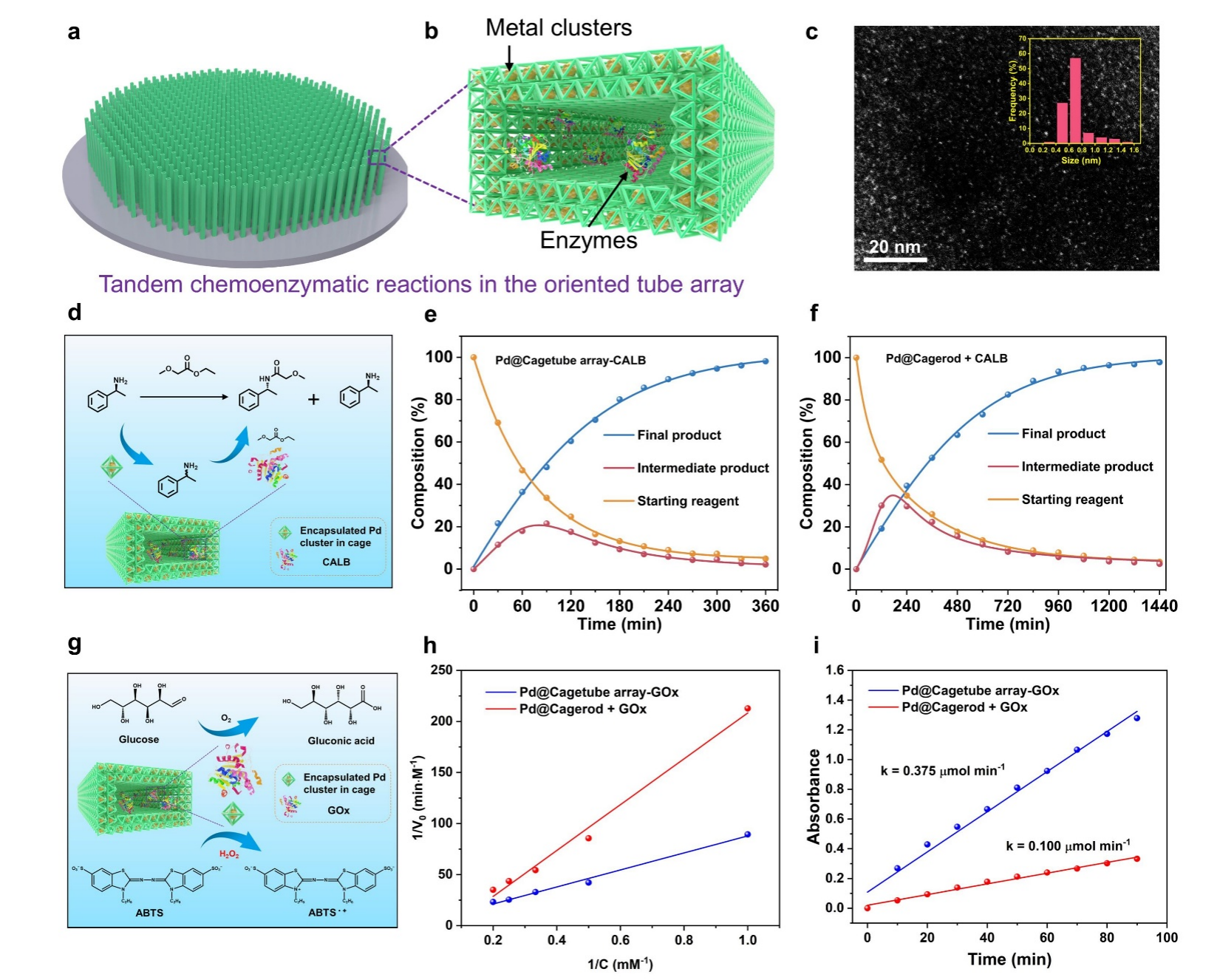 在此基础上,作者通过控制流场方向,实现了分子笼微管生长方向的精确调控,成功构建了分子笼的2D和3D取向微管阵列。吸附实验表明,与单一微孔结构相比,3D取向微管阵列显著提升了传质效率。进一步研究中,作者利用该3D取向微管阵列的微孔和管腔,分别固定了Pd团簇和酶(脂肪酶或葡萄糖氧化酶)。在一锅化学-酶串联反应中,该体系的催化活性较各组分的物理混合提高了3.8至4倍。该研究为有机分子笼多级次结构的跨尺度合成以及多孔分子基功能材料的溶液加工提供了新思路。