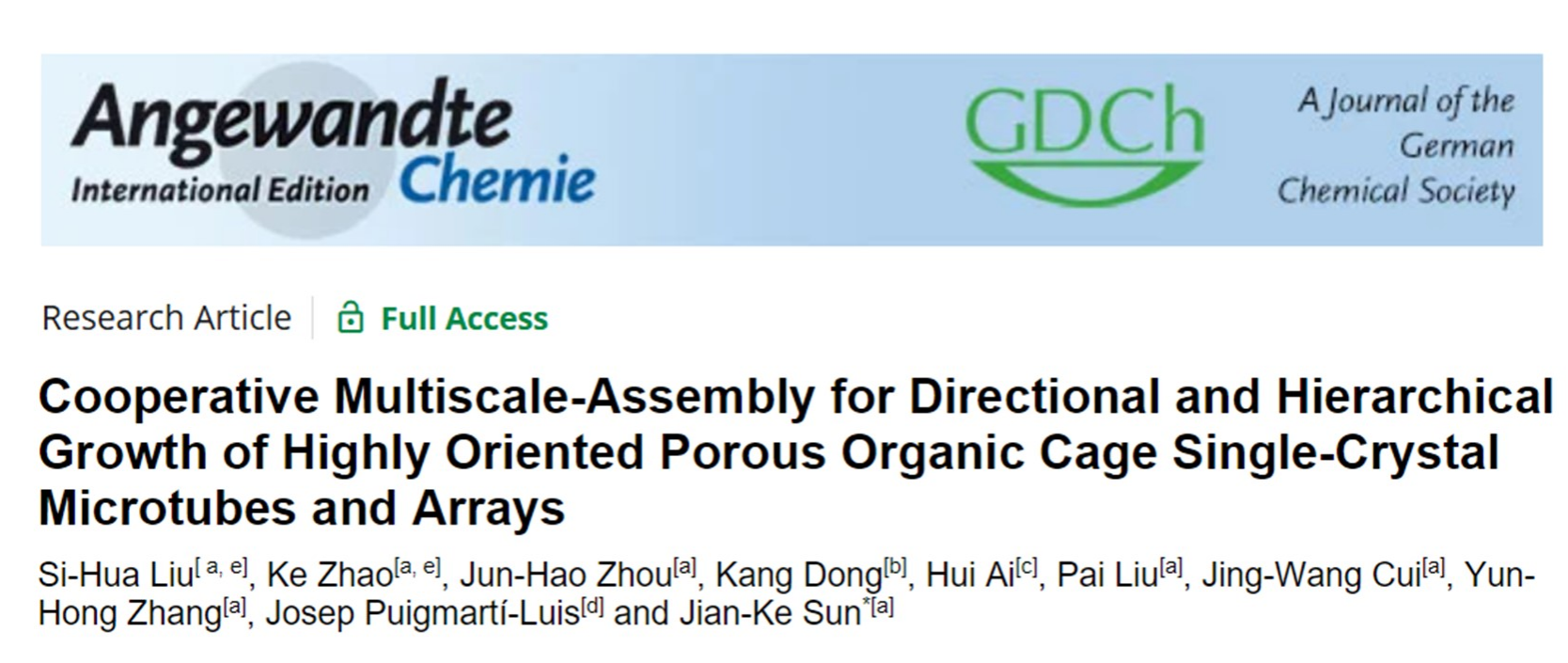 近日,亚洲无码 孙建科教授课题组在国际知名化学期刊《Angewandte Chemie International Edition》上发表题目为“Cooperative Multiscale-Assembly for Directional and Hierarchical Growth of Highly Oriented Porous Organic Cage Single-Crystal Microtubes and Arrays”的研究论文。该论文的第一作者为亚洲无码 博士后刘四华和博士研究生赵科。此项研究得到了国家自然科学基金的资助及亚洲无码 分析测试中心的支持。