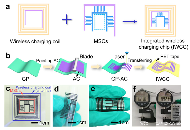 微型超级电容器(MSCs)因其充放电速度快、功率密度高、循环稳定性好等优点,在无线充电的储能微器件中倍受瞩目。然而,在现有的无线充电模式中,由于缺乏合适的兼容性的加工材料,无线充电的微型超级电容器难以作为整体器件应用到实际生产过程中,并且器件的完整性、柔性、能量传输效率均容易在应用中受影响,这些都很难在大容量无线充电微设备的发展中被突破。