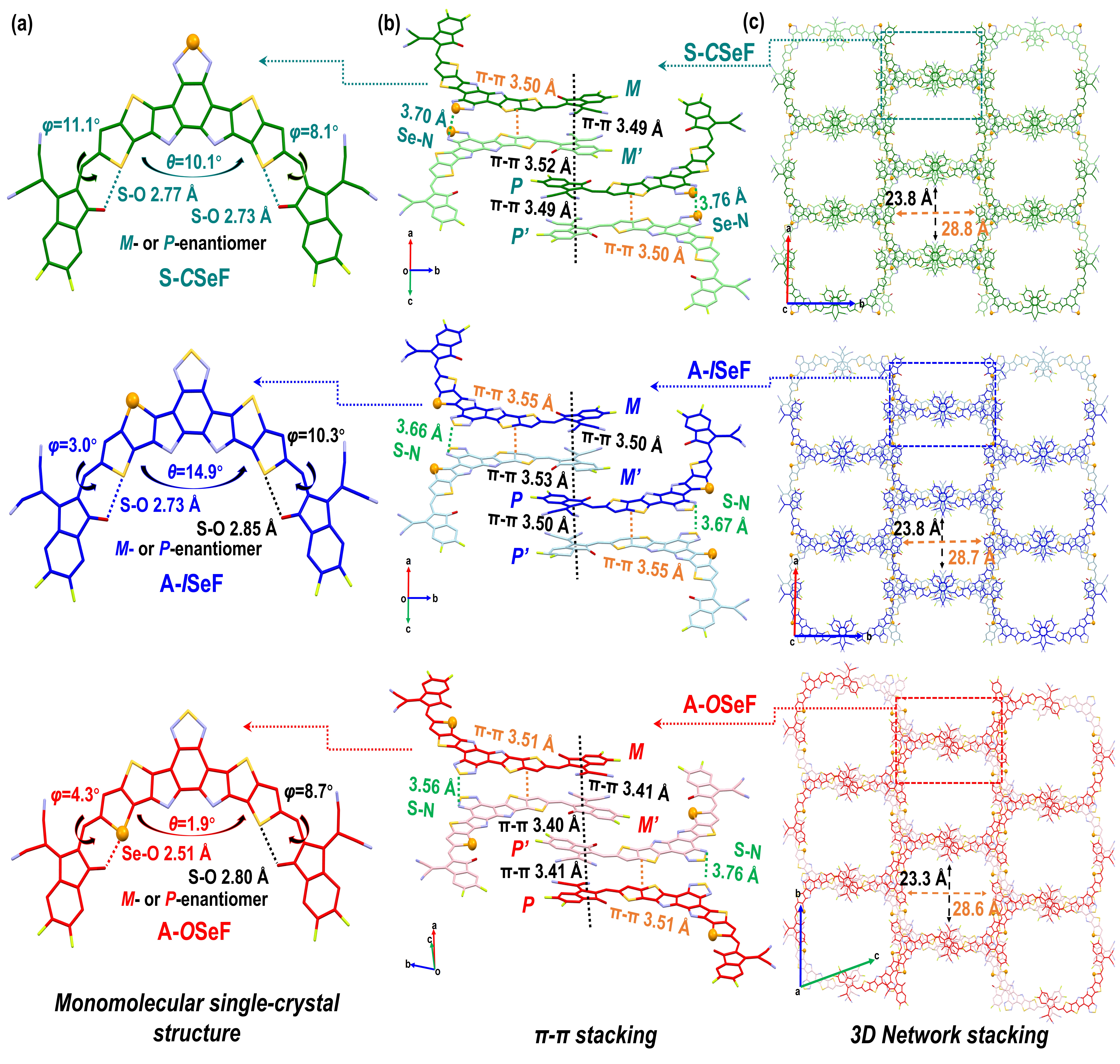 图2. 三个硒取代异构受体材料的晶体堆积图