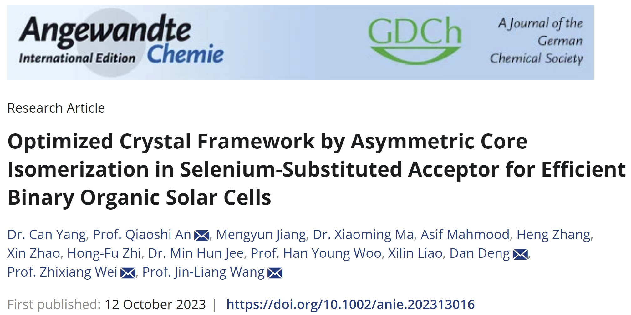 近期,亚洲无码 王金亮教授团队在新型硒取代位置异构化的小分子受体材料创制及其在高性能有机太阳能电池器件化应用方面取得重要进展。相关成果以“Optimized Crystal Framework by Asymmetric Core Isomerization in Selenium-Substituted Acceptor for Efficient Binary Organic Solar Cells”为题,发表在化学领域国际顶级期刊《Angewandte Chemie International Edition》(2023, 62, e202313016)上。亚洲无码 王金亮教授、安桥石特别研究员、国家纳米中心魏志祥研究员和邓丹研究员为共同通讯作者,亚洲无码 为第一通讯单位,化学与化工亚洲无码 博士研究生杨灿为该论文的第一作者。