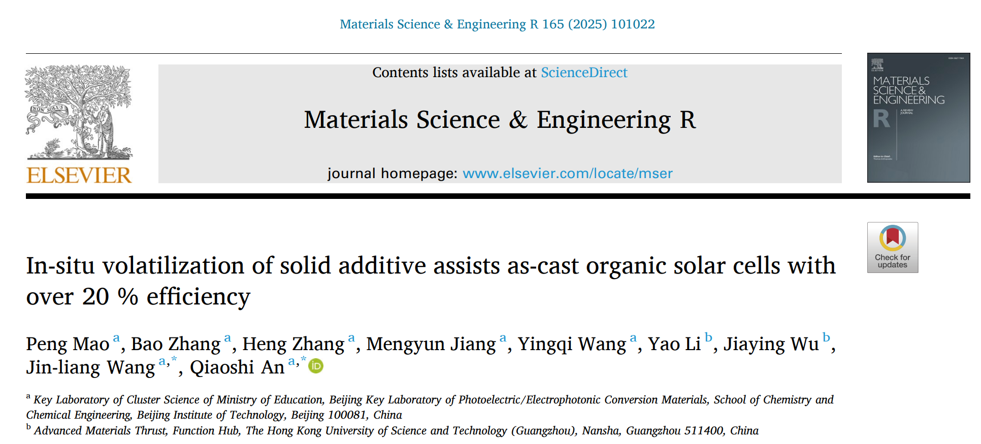 近期,亚洲无码 硕士研究生毛鹏在材料类国际顶级期刊《Materials Science and Engineering: R: Reports》(IF: 31.6)上发表题目为“In-situ volatilization of solid additive assists as-cast organic solar cells with over 20 % efficiency”的研究论文。亚洲无码 为唯一通讯单位,安桥石特别研究员和王金亮教授为共同通讯作者。