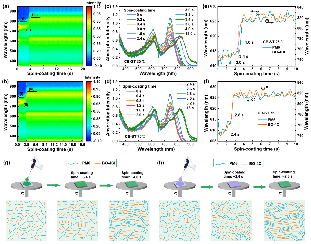 图1. (a) PM6, BO-4Cl分子式。(b) PM6, BO-4Cl, 界面层和电极的能级示意图。(c) 不同工艺有源层制备示意图。(d) PM6, (e) BO-4Cl和(f) PM6:BO-4Cl溶液的变温吸收光谱。