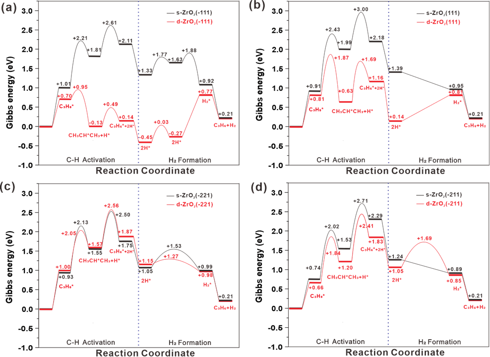 为了从分子水平上研究了上述四个晶面上PDH的反应机理和活性位点结构,构建了(-111)、(111)、(-211)和(-221)晶面的化学计量表面(s-ZrO2)和缺陷表面(d-ZrO2)结构。DFT计算表明,相比于其它晶面,d-ZrO2(-111)具有最高的本征活性。s-ZrO2(-111)表面第一个C−H键活化的位点是Zr6cI-O2c,活化能为1.20 eV。去掉二配位的O2c后,这个位点变成[Zr5cI, Zr6cII]-Ov,是d-ZrO2(-111)表面第一个C−H键的活化位点,活化能为(0.25 eV)。s-ZrO2(-111)表面和d-ZrO2(-111)表面第二个H原子均位于Zr6c和Zr6cI(缺陷表面为Zr5cI)的桥位上,活化能分别为0.80 eV 和0.62 eV(图2)。由此可以看出,ZrO2(-111)晶面上氧空位的生成可以显著降低C−H键断裂的活化能,且在(-111)和(111)等低指数面上,氧空位的形成会产生更强的Lewis酸碱对,有助于PDH活性的增加。而对于(-221)和(-211)晶面,台阶位处Zr原子的配位数低于氧空位处Zr原子的配位数,氧空位的形成对PDH活性的影响则很小。