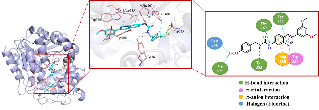 分子对接与动力学研究表明,化合物68位于sEH蛋白的活性口袋中,并与关键氨基酸Asp335、Tyr383和Tyr466形成了强烈的相互作用,从而稳定了sEH蛋白的结构。分子作用力分析结果强调了喹啉环和三氟甲氧基苄基脲基团对sEH抑制活性的重要贡献,这与新型苯基喹啉类sEH骨架的构效关系研究结果一致。