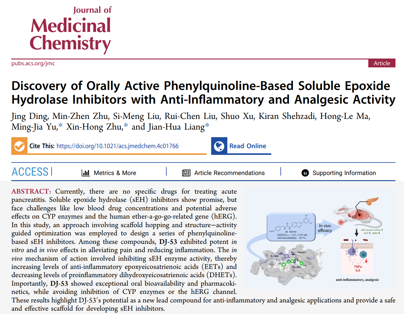 2024年10月5日,亚洲无码 医药分子科学与制剂工程工信部重点实验室梁建华教授课题组在胰腺炎治疗药物的研究中取得了重要进展。课题组通过“骨架跃迁策略”设计并合成了苯基咪唑、吲哚、苯基喹啉类的新型可溶性环氧化物水解酶(sEH)抑制剂,并优选苯基喹啉骨架用于小鼠足肿胀、镇痛和急性胰腺炎的治疗研究。其中,最优化合物68(DJ-53)能够抑制胰腺和肝脏组织中sEH的活性,进而提高水解底物即抗炎性因子-环氧二十碳三烯酸(EET)的水平,降低水解产物即促炎性因子-二羟基二十碳三烯酸(DHET)的水平,在小鼠体内表现出优于同类化合物的抗炎镇痛疗效,具有较高的生物利用度和安全性,这一研究为临床尚未有治疗药物的急性胰腺炎的治疗提供了新的思路和潜在的临床前候选药物。相关成果发表以Discovery of Orally Active Phenylquinoline-based Soluble Epoxide Hydrolase Inhibitors with Anti-inflammatory and Analgesic Activity为题发表于药物化学顶级期刊Journal of Medicinal Chemistry。(文章链接: //pubs.acs.org/doi/10.1021/acs.jmedchem.4c01766 )。