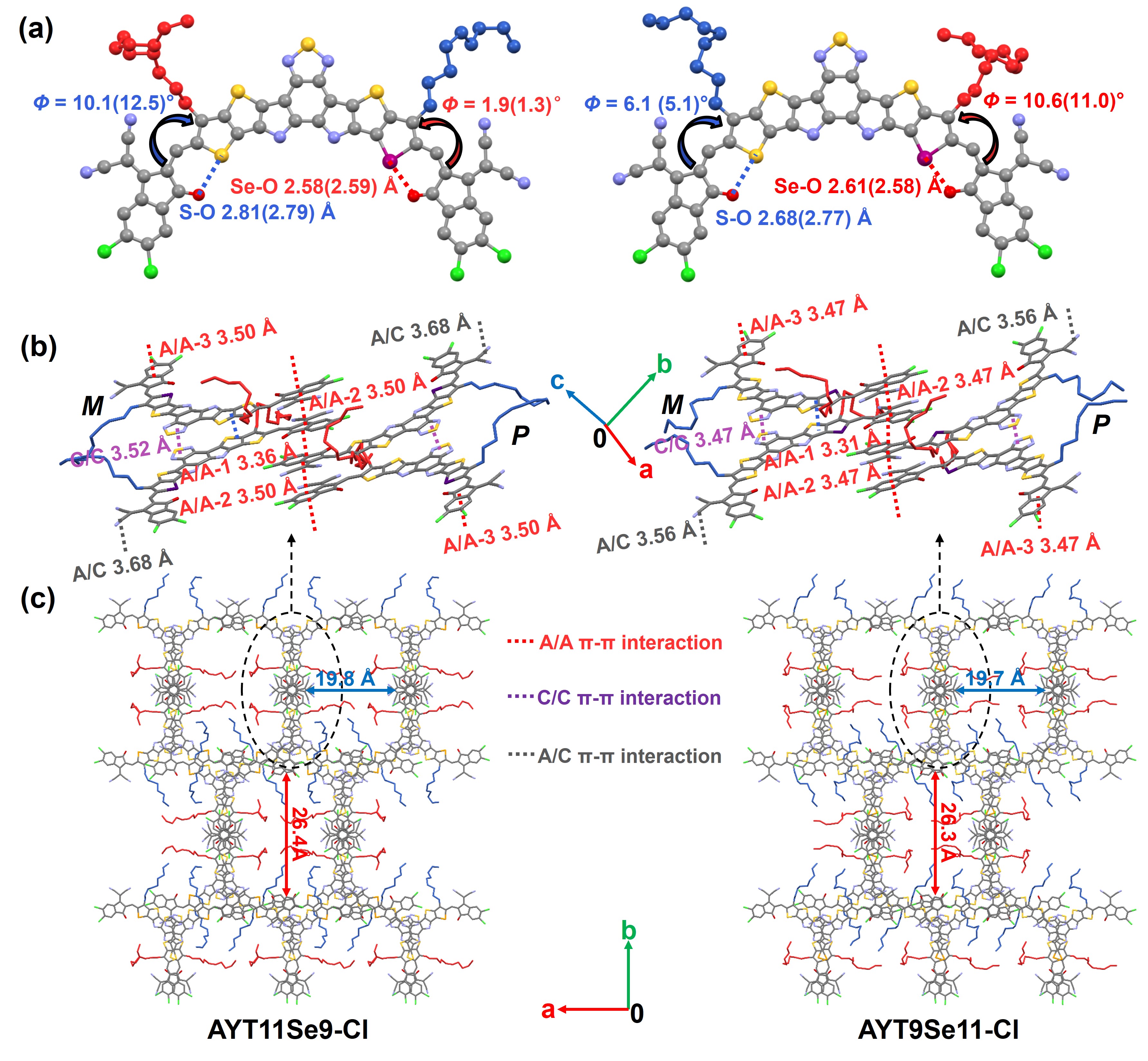 针对上述的关键科学问题,王金亮教授团队在前期硒和异卤原子取代砌块集成的新型单分散受体材料的创制及其在高性能有机太阳能电池中的应用研究工作(Angew. Chem. Int. Ed. 2021, 60, 19241, ESI高被引论文; Angew. Chem. Int. Ed. 2022, 61, e202209454; Energy Environ. Sci., 2021, 14, 3945-3953, 前封面和高被引论文; Energy Environ. Sci., 2022, 15, 320; Energy Environ. Sci., 2021, 14, 90,高被引论文;Adv. Funct. Mater., 2022, 32, 2200807; ACS Energy Lett., 2018, 3, 2967等)的基础上,为了实现更高效率的硒吩类受体材料体系,将基于硒吩的不对称中心核工程和不同的烷基链策略相结合,在不改变烷基链总长度的情况下,最近设计并合成了一对A-D1A’D2-A型双不对称异构体(AYT11Se9-Cl和AYT9Se11-Cl,其具有相同的苯并噻二唑作为A’单元和两个缺电子端基作为A单元,但同时具有两个不同的基于硒吩和噻吩的不对称D1A′D2中心核,并且分别在中心单元中最外侧的硒吩环/噻吩环处连接有n-壬基和n-十一烷基链。系统地探讨了两种不对称区域异构体的光电行为、详细分子间填充的单晶结构、与聚合物给体PM6的共混形态以及相应OSCs的性能的影响。