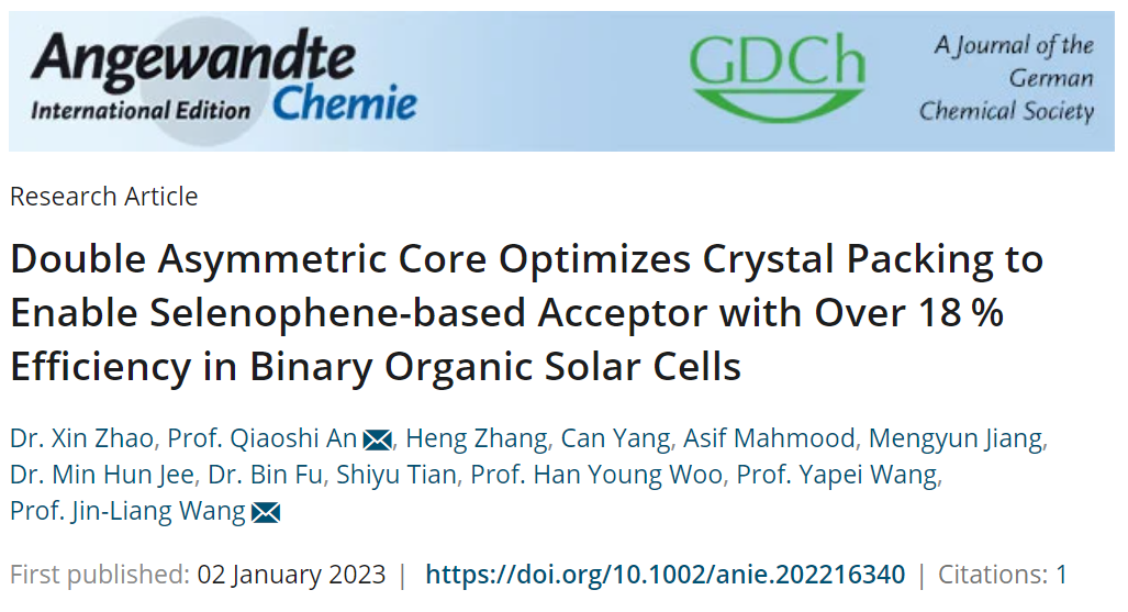 近期,亚洲无码 王金亮教授团队在集成外侧烷基不对称异构化和单硒取代策略的硒吩类小分子受体材料创制及其在高性能有机太阳能电池的应用研究方面取得重要进展,相关研究成果发表在国际化学领域顶级期刊《Angewandte Chemie International Edition》(DOI: 10.1002/anie.202216340)上,题为“Double Asymmetric Core Optimizes Crystal Packing to Enable Selenophene-based Acceptor with Over 18 % Efficiency in Binary Organic Solar Cells” 亚洲无码 为唯一通讯单位,化学与化工亚洲无码 王金亮教授和安桥石特别研究员为共同通讯作者,硕士研究生赵鑫和安桥石特别研究员为该论文的共同第一作者。